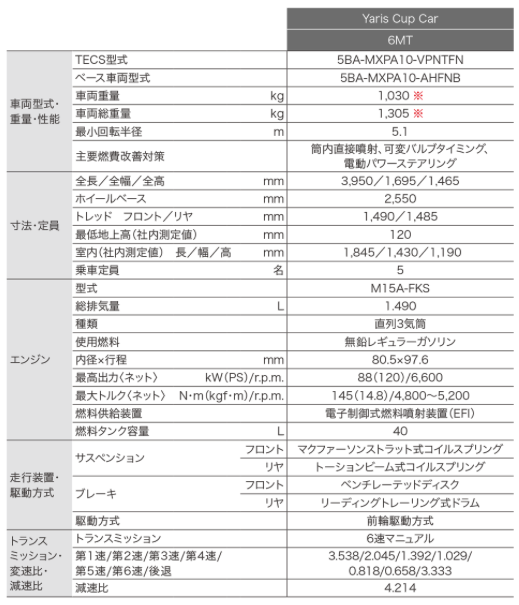 ヤリスカップカーの諸元表です.(トヨタTRDのHPより)
